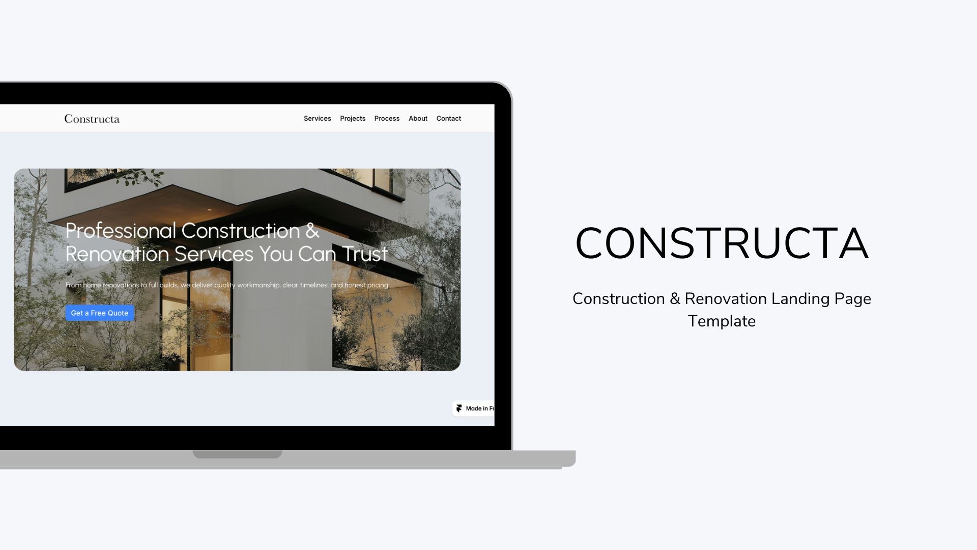 Constructa is a clean, conversion-focused landing page template created specifically for construction and renovation businesses. Built with Framer, it balances trust, clarity, and user-friendly design to help businesses showcase services, communicate value, and drive inquiries from potential clients. The layout is easily customizable and optimized for both desktop and mobile experiences — making it ideal for lead generation, local search, and business growth.